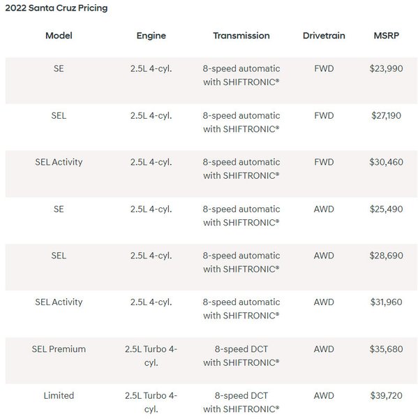 Версії Hyundai Santa Cruz з турбодвигуном ще дорожчі і доступні тільки у двох багатих комплектаціях. У першій з них за 35 680 доларів є світлодіодні фари, двозонний клімат-контроль. А найдорожчий Santa Cruz 2.5 T-GDI в комплектації Limited коштує 39 720 доларів. У такої машини 20-дюймові колеса, шкіряні сидіння з підігрівом і вентиляцією, кермо з підігрівом, більший 10,25-дюймової дисплей медіасистеми, аудіосистема преміум-класу Bose. Крім того є система кругового огляду, інтелектуальна система обмеження швидкості та адаптивний круїз-контроль з функцією гальмування до повної зупинки.