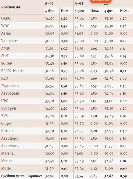 У мережах WOG та ОККО бензини А-92 та А-95 подорожчали на 1,49–1,59 грн/л, до 34,99 та 35,84 грн/л. Дизель до зазначених АЗС додав у вартості 1,46 грн/л, до 35,30 грн/л.