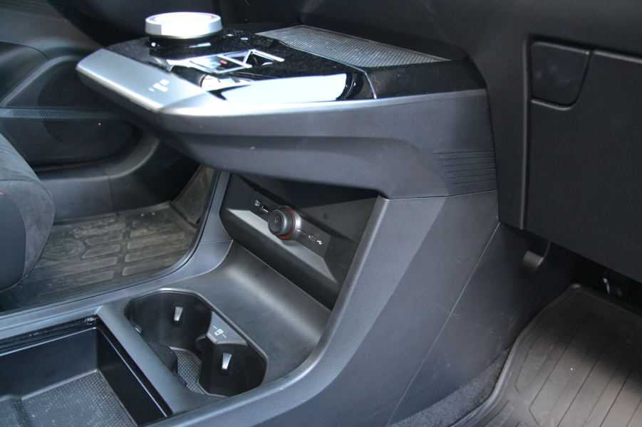 Центральна консоль виконана двоповерховою. На верхній полиці знаходяться "шайба" перемикача режимів їзди та бездротова зарядка для смартфону. Утім, виїмка для телефону не надто глибока і при різкому старті він може випасти.