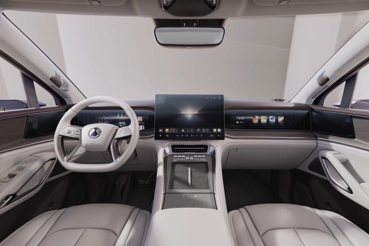 У салоні Denza N9 на передній панелі встановили три дисплеї, ще один монітор розкладається зі стелі для задніх пасажирів. Кросовер оснастили панорамним дахом, холодильником, пневмопідвіскою і системою напівавтономного руху, а за доплату бокові дзеркала можна замінити камерами.