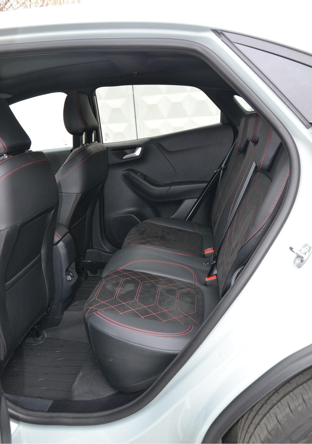 Салон Ford Puma не дуже широкий, тому тут комфортніше двом пасажирам. Підлокітник на задньому ряді відсутній (хоча це не дивина для сегменту B-SUV), але є USB-порти.
