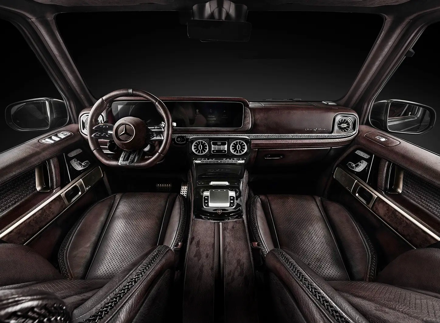 Салон "Гелендвагена" оздобили дорогою патинованою шкірою та встановили спортивні передні сидіння. Гравійовані скандинавські візерунки з’явилися і всередині.