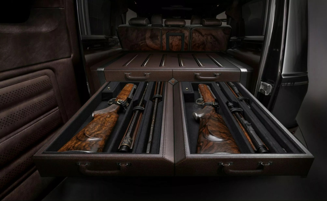 У багажнику встановили ящики для зброї. У комплекті з Mercedes G-Viking ідуть чотири мисливські рушниці. Вони також прикрашені гравіюванням, а ще оздоблені 24-каратним золотом.