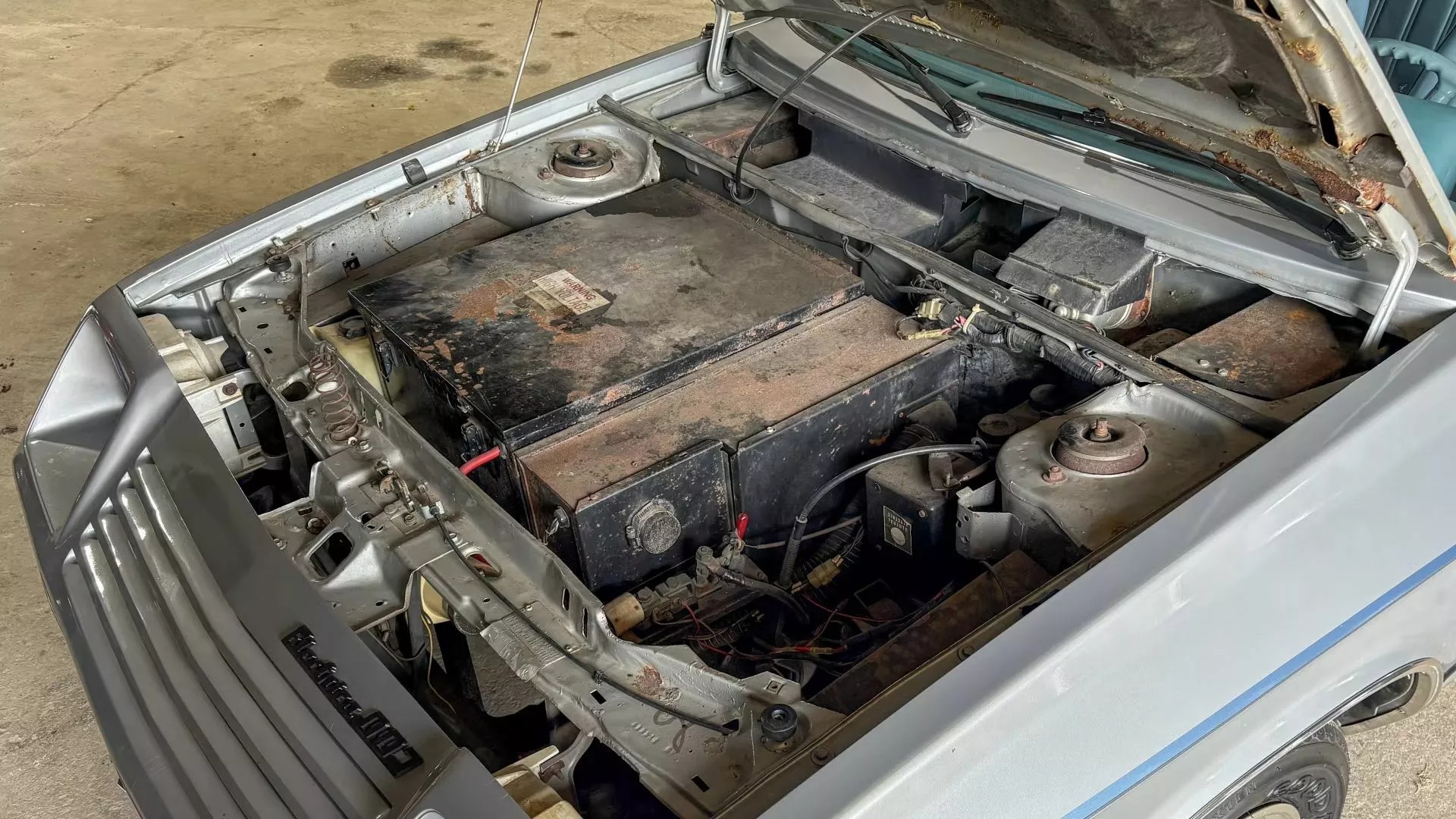 Конкретно цей електромобіль Dodge Jet Electrica потребує реставрації. Він місцями проіржавів, а з багажника забрали всі акумулятори, бо вони відпрацювали свій ресурс.