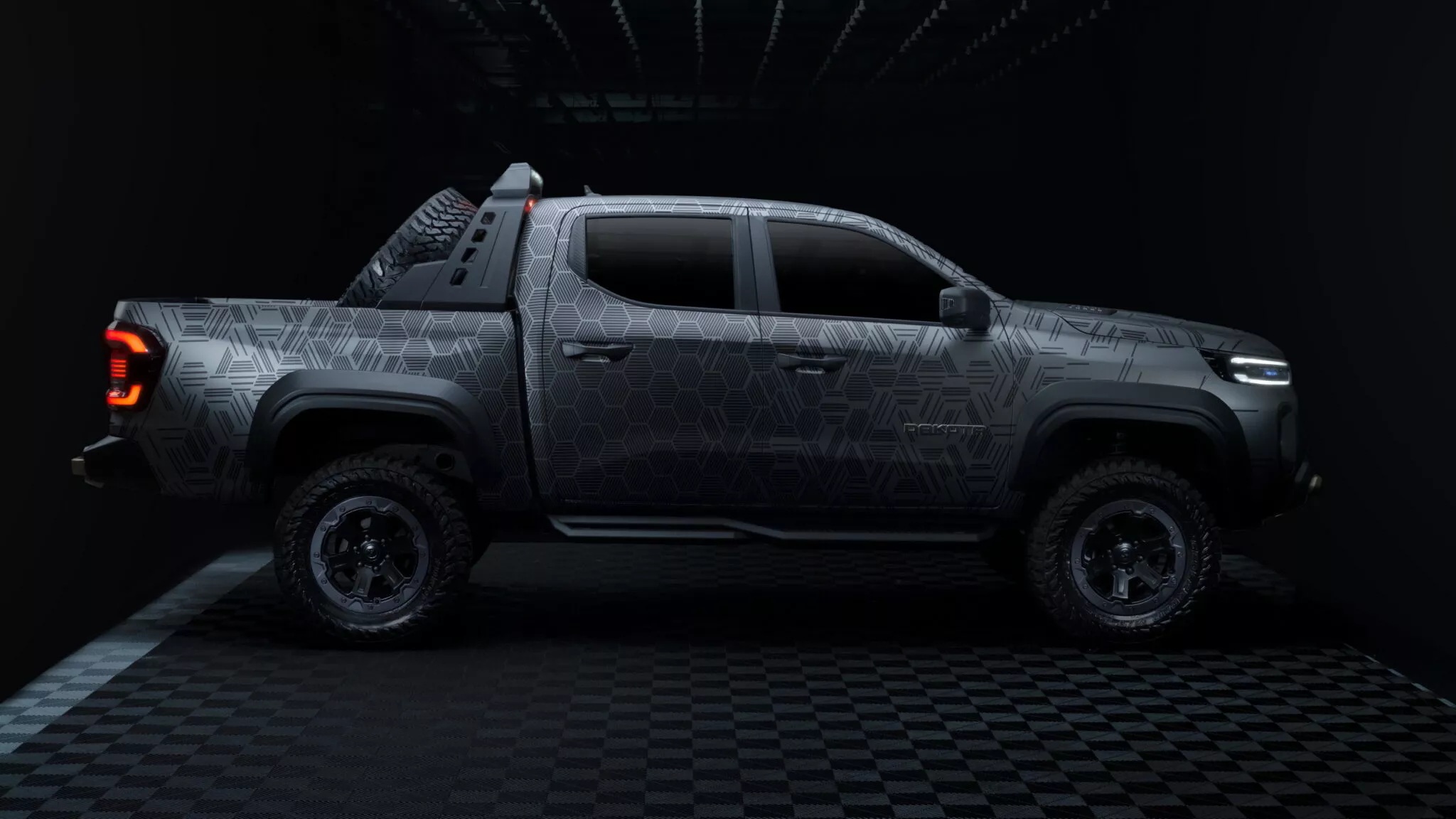 Крім того, концепт Ram Dakota Nightfall отримав 33-дюймові позашляхові шини, лебідку, дуги, додаткову оптику та підніжки, а його кузов прикрасили оригінальним візерунком.