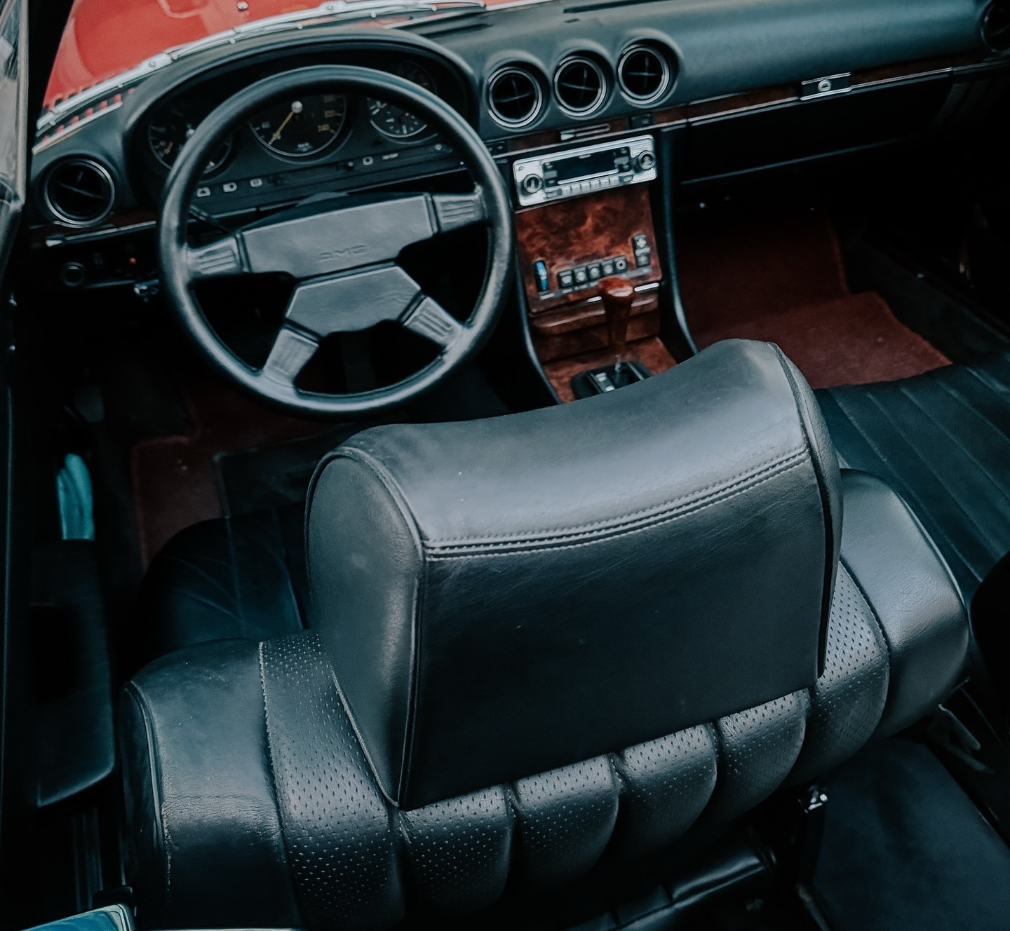 У салоні Mercedes SL R107 замінили кермо. В оздобленні використано шкіру та дерево.