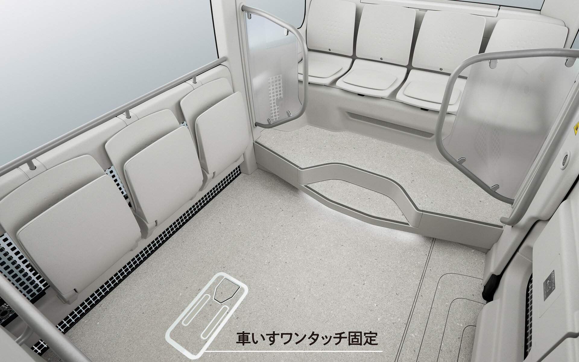 Салон розрахований на 16 пасажирів, 7 з яких – сидячі. На водійському місці встановили кермо-штурвал та п'ять екранів (два з них – для камер, які заміняють дзеркала), є монітори і для пасажирів. Наразі нова Toyota e-Palette оснащена системою напівавтономного руху, проте невдовзі для неї буде готовий повноцінний автопілот.