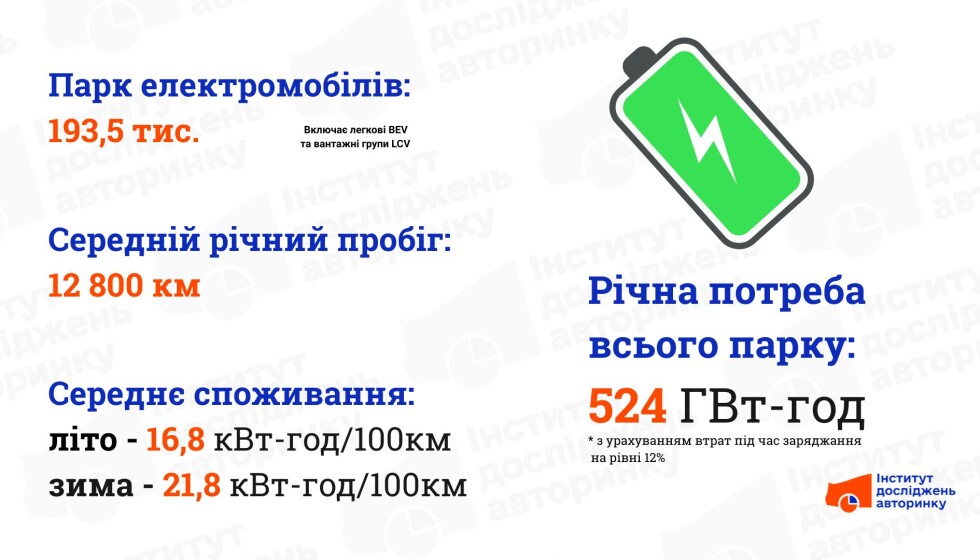 Фахівці встановили, що середнє споживання електроенергії становить 16,8 кВт∙год на 100 км влітку та 21,8 кВт∙год на 100 км взимку. Отже, в середньому за добу всі електромобілі в Україні споживають 1141 МВт∙год влітку та 1480 МВт∙год взимку.