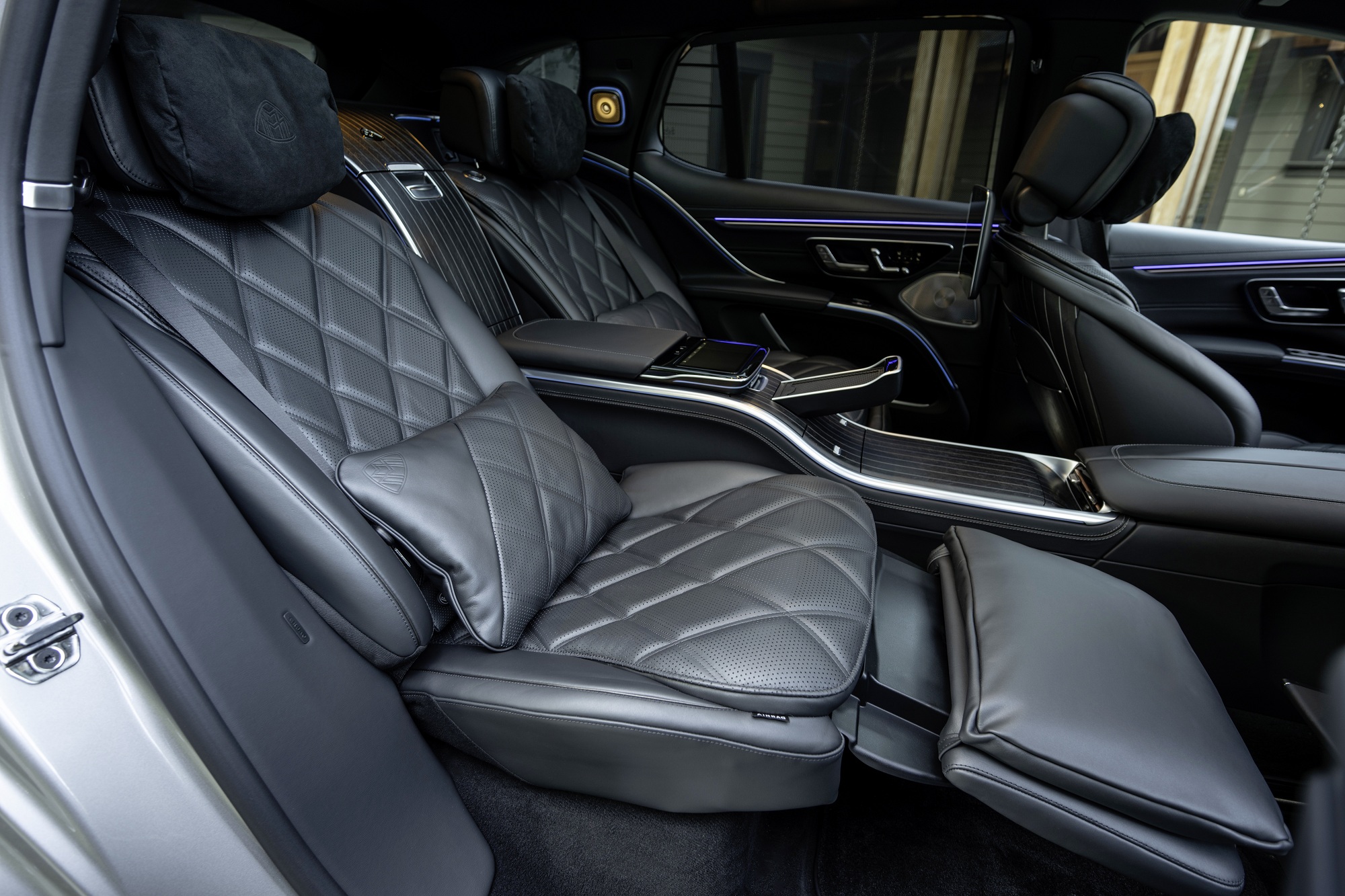 На другому ряду авто встановлено окремі крісла з електроприводом, вентиляцією і масажем. Також комплектація включає чотиризонний клімат-контроль, пневмопідвіску, сканер відбитків пальців, екрани для задніх пасажирів та набір фірмових бокалів.