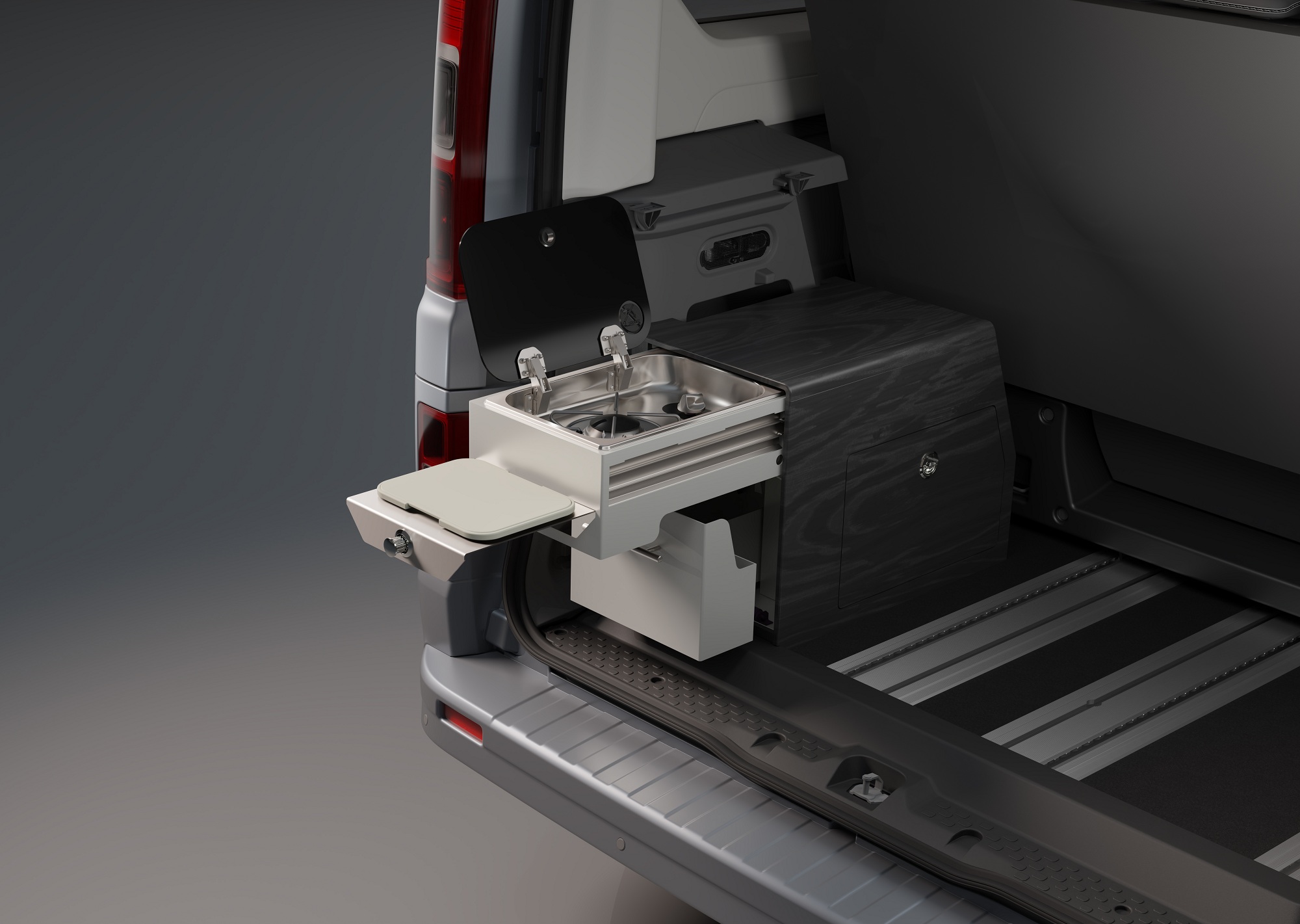 У багажнику Renault Trafic Escapade змонтували портативну кухню. Невеликий модуль включає газову плиту, раковину з 5-літровим баком води та шафи для кухонного приладдя.