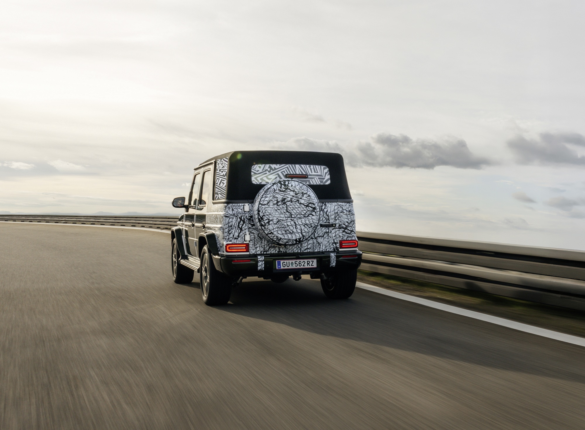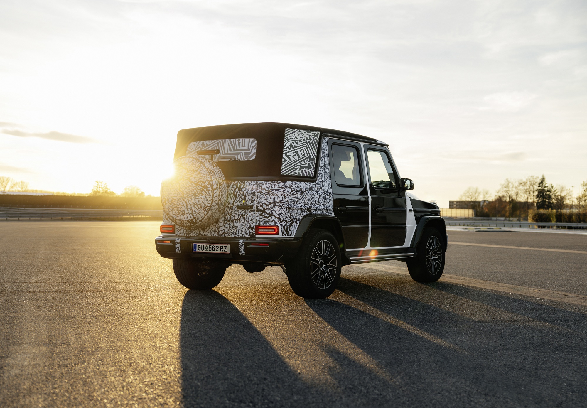 На фото Mercedes G-Class Cabriolet частково прикритий камуфляжем, але можна розгледіти складний верх із тканини. Чотиридверний позашляховик зберіг стійки даху.