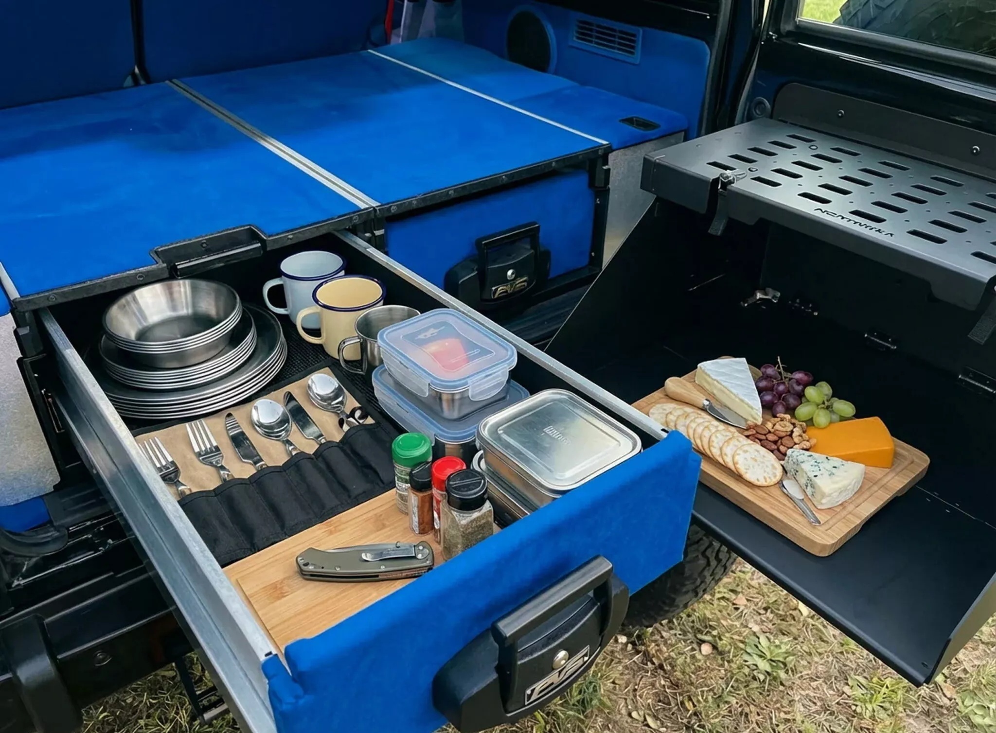 У багажнику Toyota Land Cruiser 70 з’явився органайзер із шухлядами, в який помістили набір для пікніка – посуд, столове приладдя та невеликий столик.