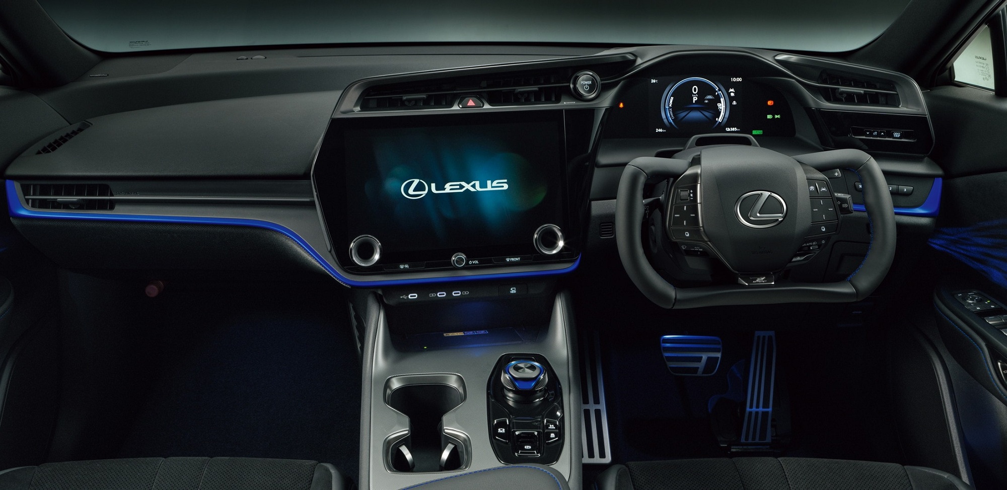 Салон Lexus RZ 600e F Sport Performance оздобили шкірою та алькантарою із контрастними синіми вставками. Електрокар отримав спортивні сидіння, а також компактне кермо-штурвал.
