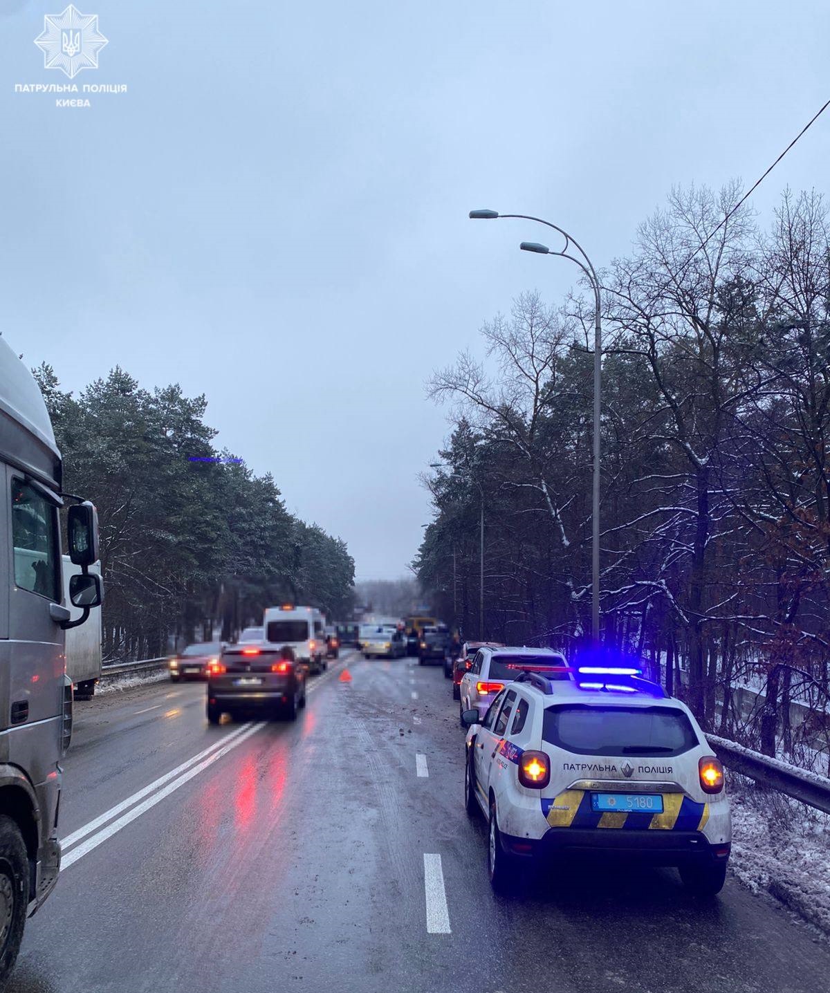 Через аварію ускладнено рух транспорту в напрямку міста Вишгорода. Патрульна поліція, яка прибула на місце ДТП, організувала об’їзд ділянки зустрічною смугою.