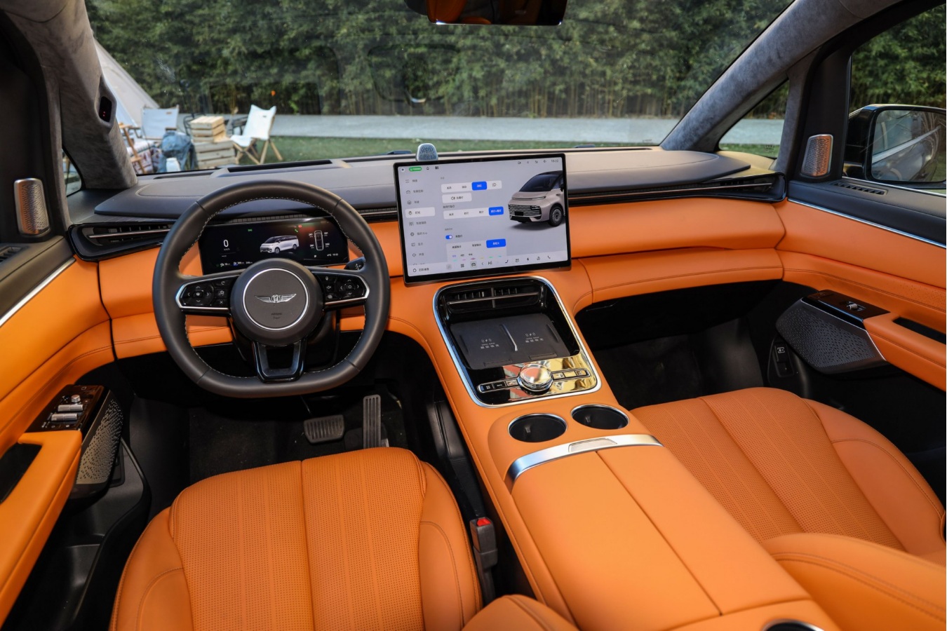 Комплектація Geely Galaxy V900 доволі багата: у шкіряному салоні встановлено п’ять дисплеїв, а крісла першого та другого ряду мають електропривід, підігрів, вентиляцію і масаж.