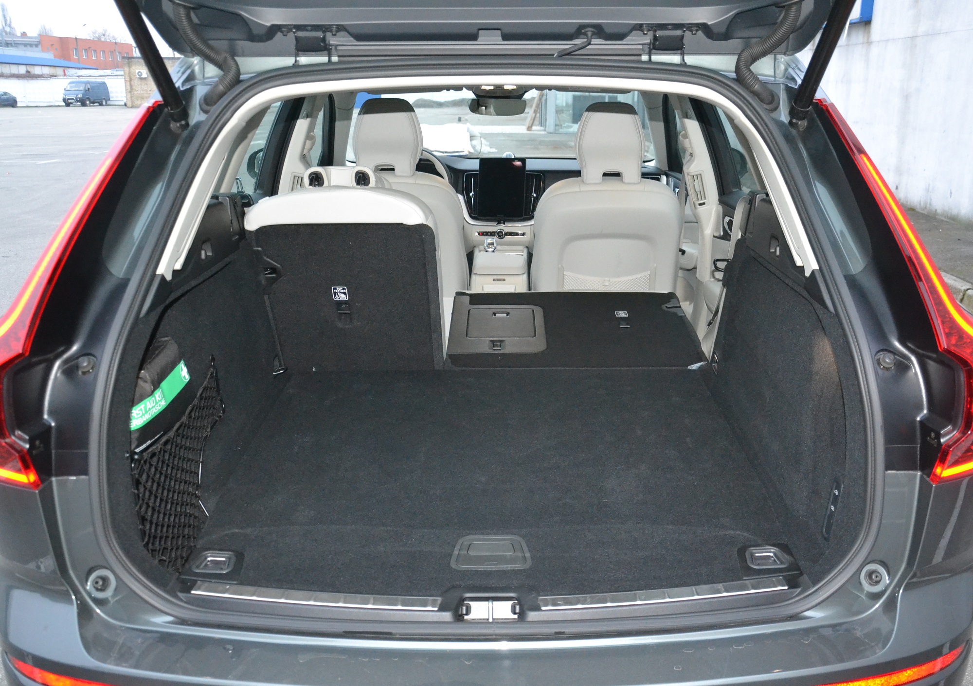 Об’єм багажника Volvo XC60 становить 468 л у звичайному стані та 1432 л – зі складеними задніми кріслами. Через елементи гібридної установки під підлогою немає запаски, але є органайзер. Двері оснащені електроприводом у всіх Volvo XC60 2026.