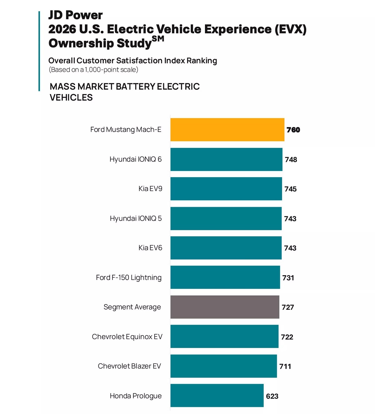 У преміумкласі найбільше задоволені власники Tesla Model 3 (індекс 804) та Model Y (797), а найменше — Audi Q6 e-tron (690). У масовому сегменті найбільше припали до душі власникам Ford Mustang Mach-E (760) та Hyundai Ioniq 6 (748), а найменше — Honda Prologue (623).