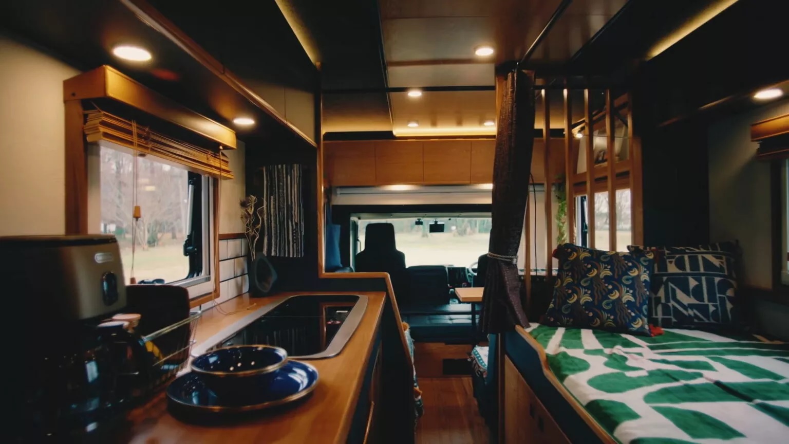 Усередині встановили двоспальне ліжко та розкладний диван. Також є кухня із плитою та духовкою та невеликий обідній стіл. Крім того, комплектація включає проєктор із чималим екраном.