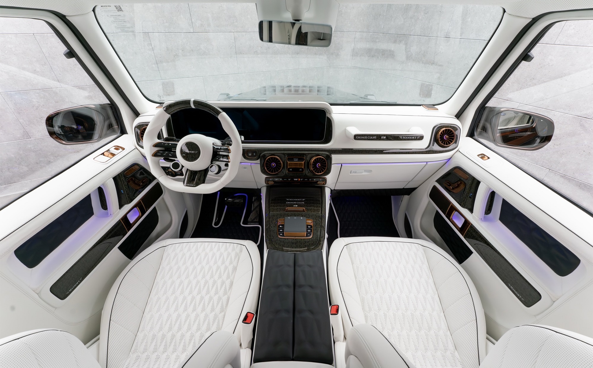 Салон "Гелендвагена" оздобили білою шкірою та карбоном. Декор мідного кольору з’явився і всередині.