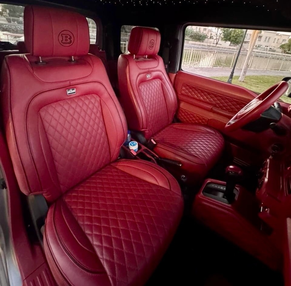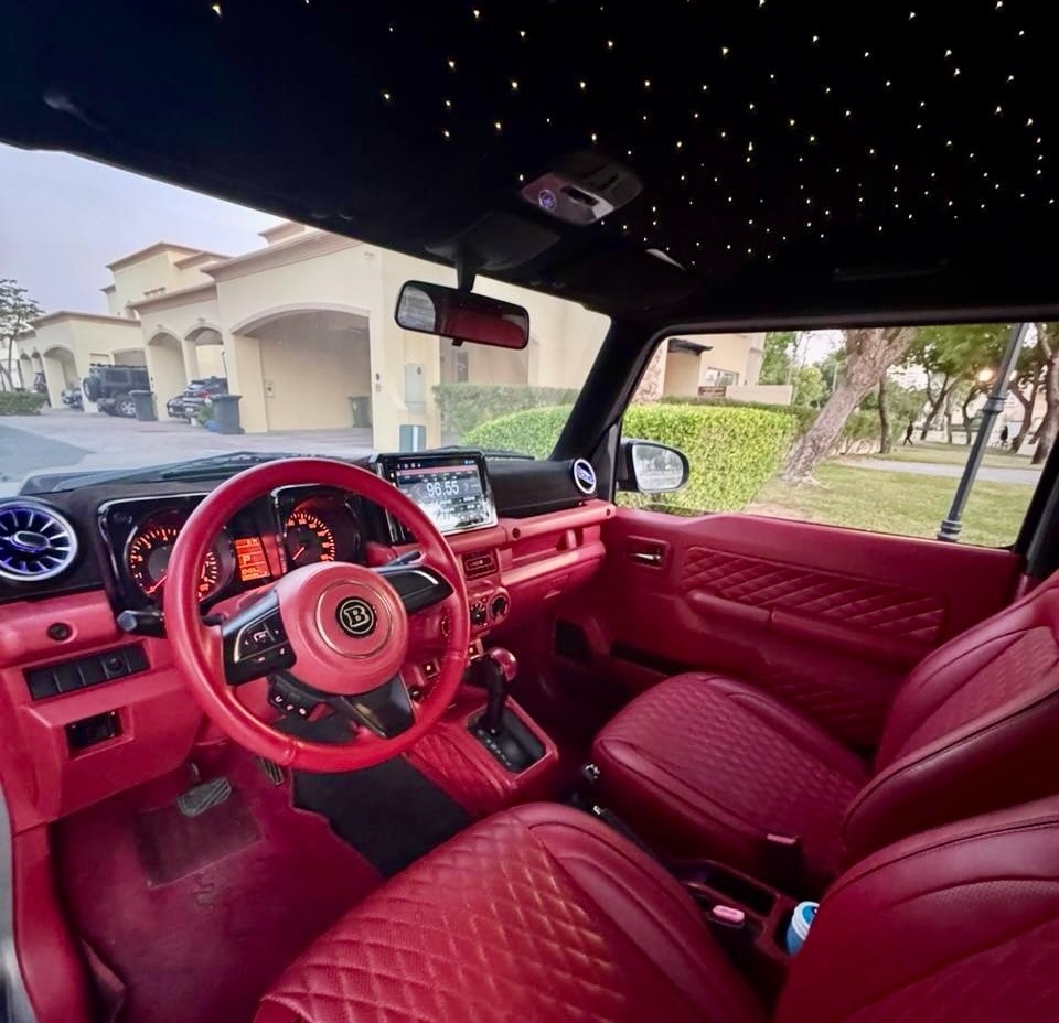 Салон Suzuki Jimny обшили червоною перфорованою шкірою та встановили круглі дефлектори обдуву як в "Гелендвагена". Підсвічування стелі нагадує зоряне небо — як у Rolls-Royce.