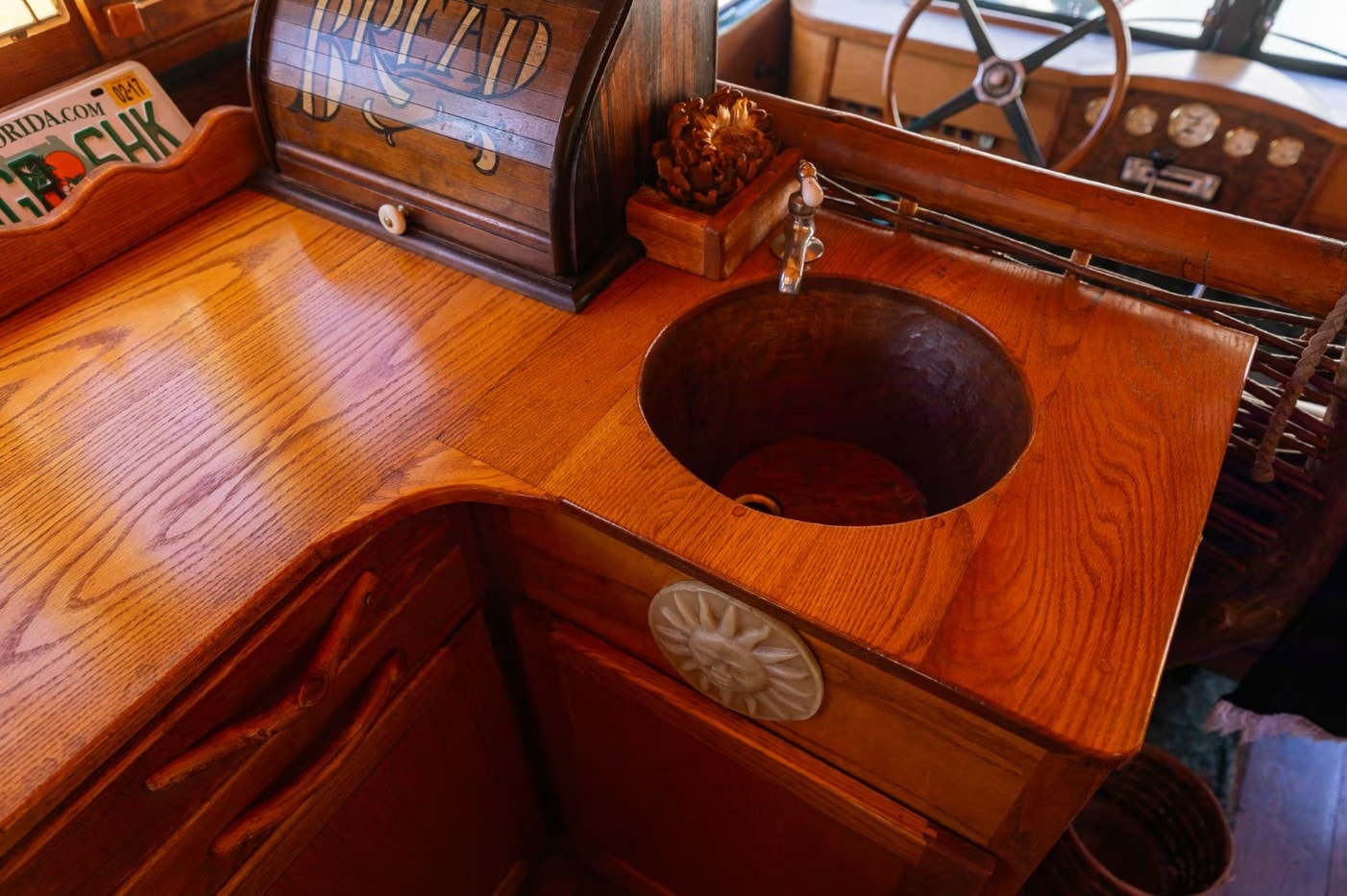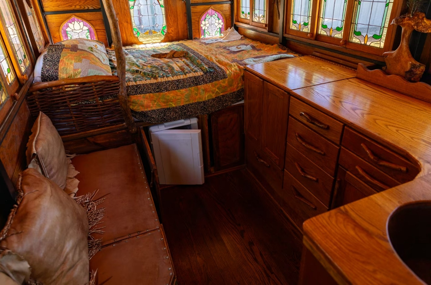 Усередині встановлені двоспальне ліжко, оздоблена шкірою лава та старовинні дерев’яні меблі. Примітно, що навіть раковина виготовлена з дерева. Водійське місце відділене від жилого модуля оригінальним плетеним "тином".