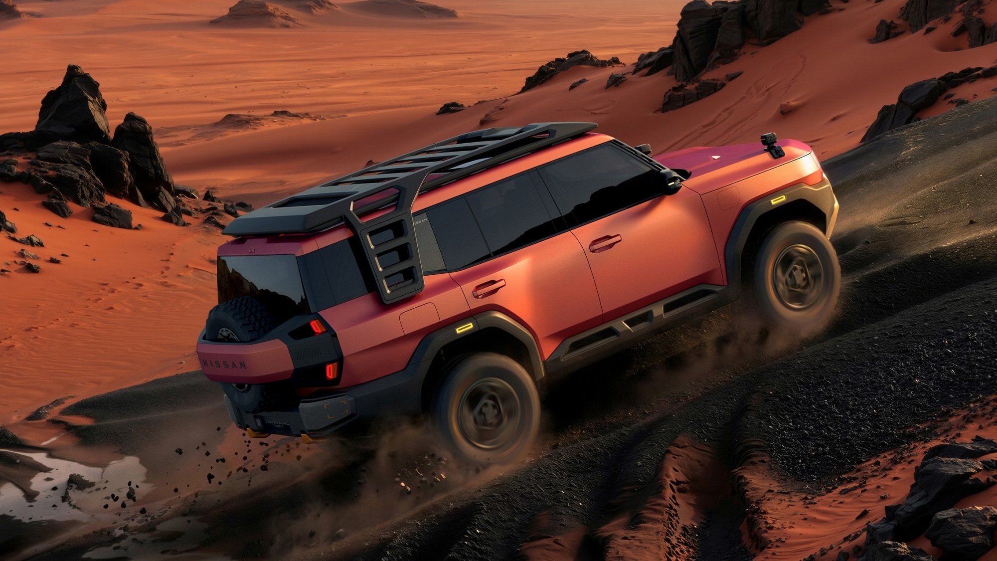 Концепт Nissan Terrano PHEV — середньорозмірний позашляховик із класичним двооб'ємним силуетом та брутальним рубаним дизайном. У нього високий кліренс і короткі звиси кузова, а бампери скошені знизу для збільшення кутів в'їзду та з'їзду. Автомобіль отримав позашляхові шини Mickey Thompson, багажник на дах та додаткову оптику.