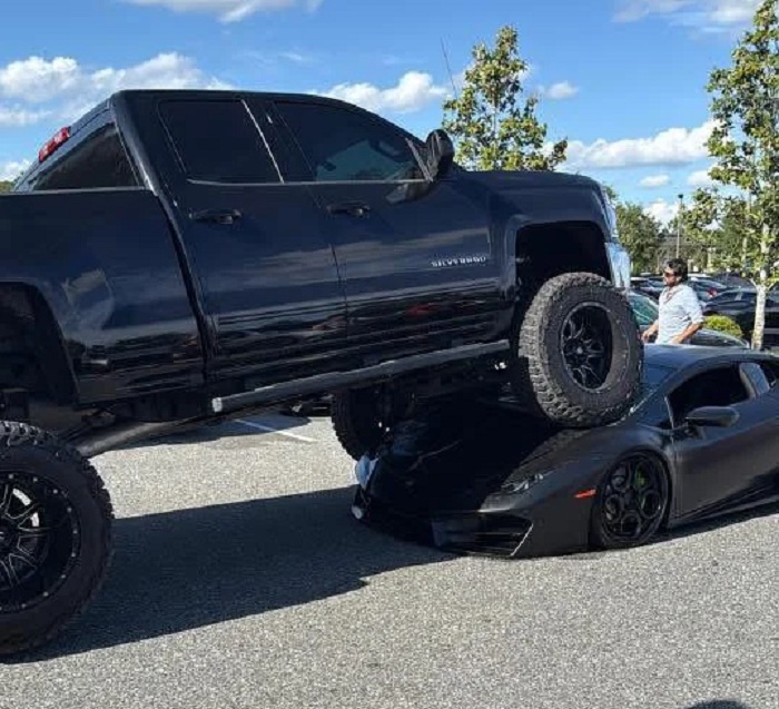 Інцидент потрапив на відео. Видно, що пікап Chevrolet Silverado зі збільшеним кліренсом і позашляховими шинами їхав по парковці на занадто високій швидкості, зіткнувся з купе Lamborghini Huracan та заїхав на нього.