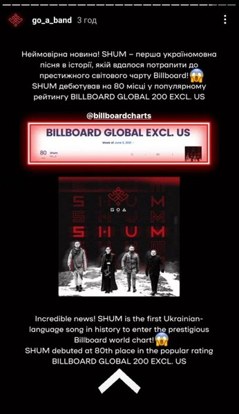 "Неймовірна новина! Shum — перша україномовна пісня в історії, якій вдалося потрапити в престижний світовий чарт Billboard! Shum дебютував на 80-му місці у популярному рейтингу Billboard Global 200 Excl. US", — повідомляється в сторіз.