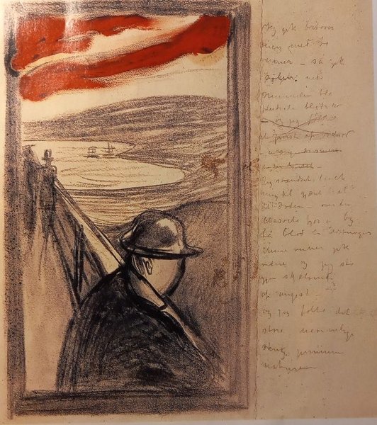 Взагалі є ескіз 1891 року, де молодий чоловік із двома приятелями віддалік — на мосту. Міст не в Ніцці, а в Осло — тут рідніше лякатися. Міст — сильний символ. Міст — це перехід: із берега на берег, між життям і смертю тощо. Захід сонця, як бачите, на ескізі — криваво-червоний.