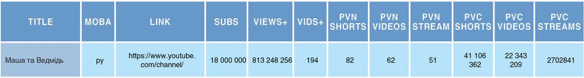 Як зазначало видання detector.media, в Україні рейтинг найпопулярніших дитячих каналів на сервісі потокового відео Youtube очолює російський канал "Маша та Ведмідь". Він перекладений та адаптований під українську аудиторію й наразі лише за 2025 рік має понад 800 млн переглядів.