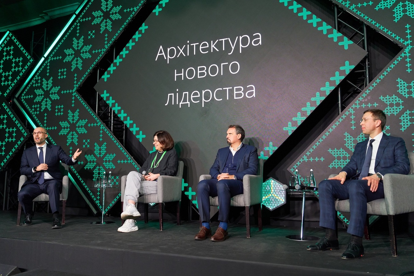 Про лідерство нового покоління та які спільні цінності можуть об’єднати бізнес, державу й військових, говорили Роман Бондар, Сергій Корецький, Оксана Сироїд, офіцерка 2-го корпусу НГУ «Хартія», доцентка Київської школи економіки, та Айварас Абромавічус, голова наглядової ради Української академії корпоративного управління (UCGA).