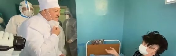 Олександр Лукашенко відвідав лікарню для лікування коронавірусу №1 в Орші, де поспілкувався із пацієнтами. В одній із палат президент спочатку сів на ліжко поруч із жінкою і торкнувся її рукою без рукавички, а потім відкрив обличчя та показав, що є справжнім.