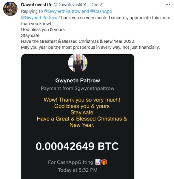 Зірка "Залізної людини" пише, що вирішила влаштувати роздачу на честь новорічних свят за допомогою програми Cash App від платіжного сервісу Block (у минулому Square), фундатором якого є колишній голова соціальної мережі Twitter Джек Дорсі. Щоб взяти участь у конкурсі, необхідно підписатися на сторінку програми, завести в ньому обліковий запис, вказати свій "кештег" — ідентифікатор у Cash App, — а також написати в коментарі під твітом Гвінет хештег #CashAppGifting.