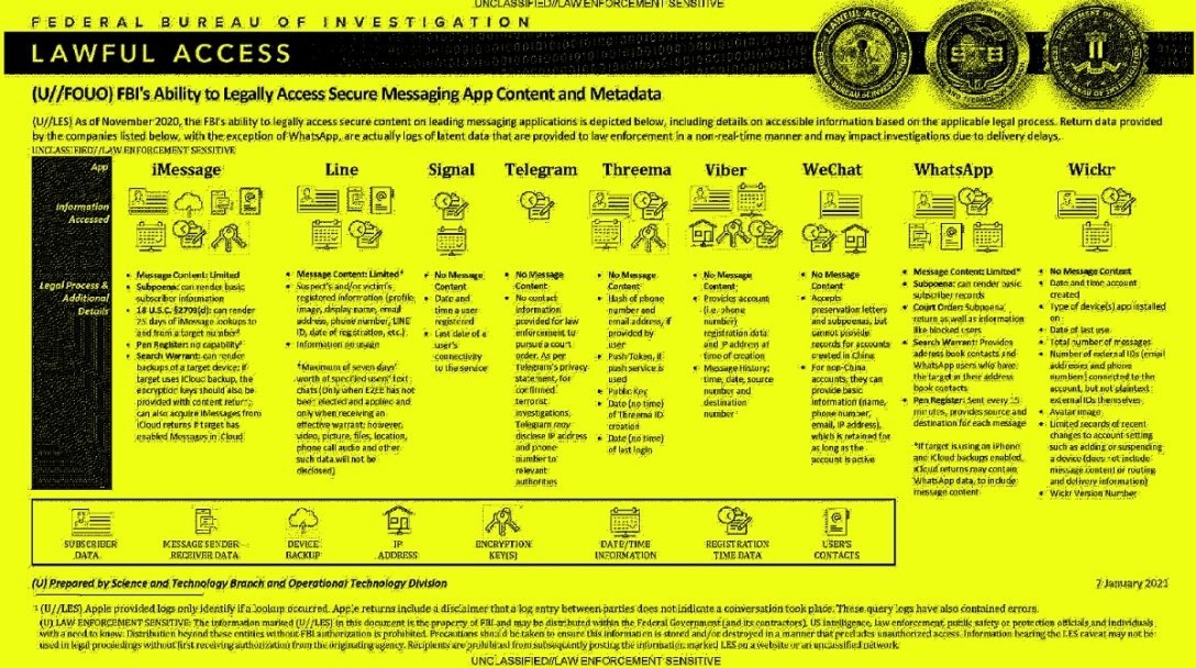 У своєму повідомленні Павло Дуров послався на розслідування видання The Record, яке отримало документи Федеральної служби розслідувань США про те, які урядові органи можуть отримати з месенджерів. Як виявилося, правоохоронці мають обмежений доступ до зашифрованих повідомлень iMessage, Line та WhatsApp. Деякі сервіси, такі як Signal, надають дані про час або дату останнього виходу користувача онлайн.