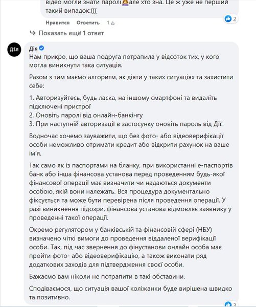 З офіційного акаунту "Дія" надійшов коментар під постом Наталії Сом з інструкцією, що необхідно зробити в подібній ситуації та побажанням не потрапляти до таких "обставин"