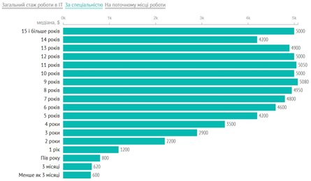 Дослідники звернули увагу, що найактивніше збільшується зарплата айтішників з досвідом роботи понад шість років. Багатьом новачкам із досвідом менш як пів року в останні місяці платили навіть менше, ніж у грудні 2021 року. Після дев'яти років в IT та після семи років роботи за спеціальністю доходи розробників практично перестають збільшуватися.