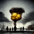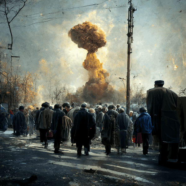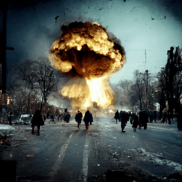 За запитом Фокусу MidJourney показала перші миті після ядерного вибуху десь в Україні та Києві зокрема. Нейромережа намалювала людей, які опинилися на вулиці у момент удару. Зважаючи на все, багато хто з них завмер від несподіванки і навіть не намагається тікати.