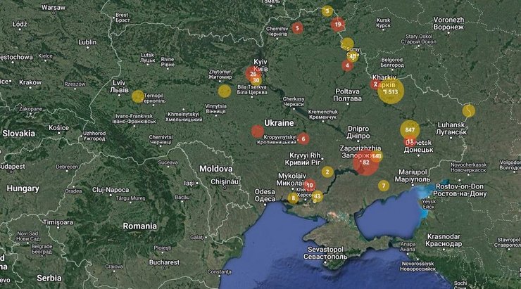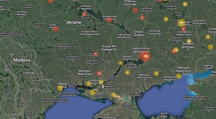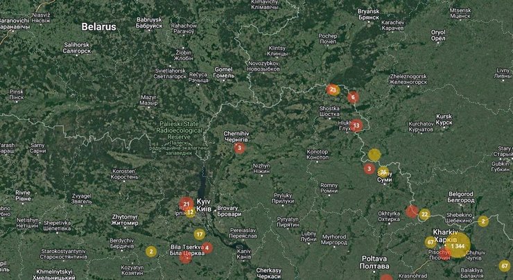 Судячи з карти, найнебезпечніші зони розташовані в Миколаївській, Запорізькій, Харківській, Чернігівській, Сумській і Донецькій областях, а також у східній частині Київської області. Декілька "червоних" локацій відзначено біля Черкас, Кременчука, Білої Церкви, Кривого Рогу, Полтави, Умані.