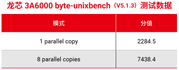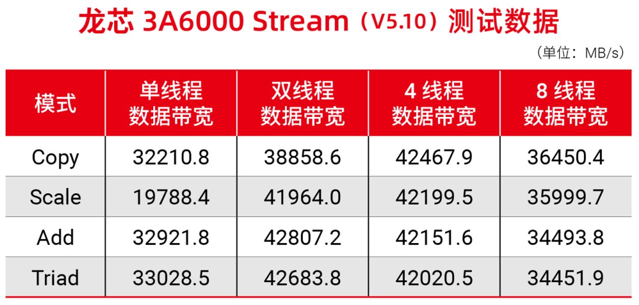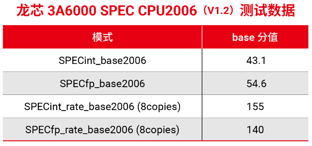 Китайський виробник мікросхем також поділився деякими показниками продуктивності чіпа, що працює з двоканальною пам'яттю DDR4-3200, 256 ГБ твердотільного накопичувача NVMe та ОС Loongnix (v20.4), в якій використовується компілятор LoongArch64 gcc8.3 (на основі Linux). У SPEC CPU2006 китайський процесор отримав базову оцінку 43,1 в INT і 54,6 у FP. У тесті Unixbench процесор Loongson 3A6000 набрав до 2284,5 бала в тесті з 1 паралельним копіюванням і 7438,4 бала в тесті з 8 паралельними копіями. Стверджується, що 3A6000 забезпечує приріст продуктивності більш ніж на 60% порівняно з попереднім китайським 3A5000. Є також оцінки потоку, які демонструють загальні показники пропускної здатності чипа.