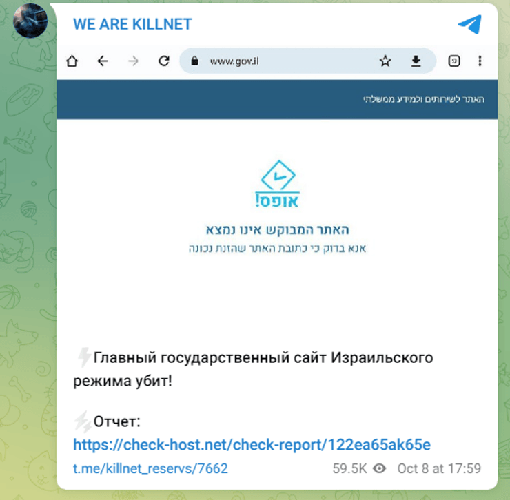 Група російських хакерів Killnet атакувала вебсайт уряду Ізраїлю після нападу бойовиків із палестинського ісламістського руху ХАМАС. Вони заявили, що така дія була відповіддю на підтримку України в конфлікті з Росією і на загострення ситуації на Близькому Сході. Про це 8 жовтня російські хакери повідомили у своєму Telegram-каналі.