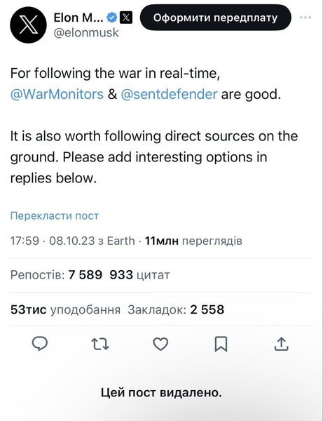 Власник соцмережі X (раніше — Twitter) Ілон Маск опублікував пост, у якому порадив користувачам підписатися на два акаунти, які неоднозначно характеризували війну в Україні. Відповідний пост він опублікував ще в неділю, 8 жовтня, проте через деякий час видалив його, не пояснивши причин.