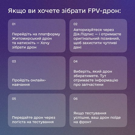 На платформі Житомирської громади можна дізнатися чіткий алгоритм дій і самостійно створити такий БпЛА. або стати постачальником запчастин чи задонатити на дрони. Жителі Житомирської громади можуть заробити за кожен зібраний дрон 6 тисяч гривень.