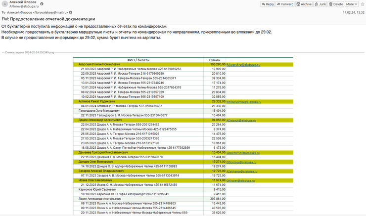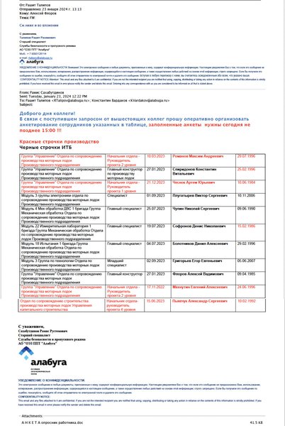 У першому листі — запит Раміса Сахабутдінова, старшого фахівця з безпеки і пропускного режиму АТ "ОЭЗ ПВТ "Алабуга". Він просить швидко провести анкетування низки працівників, бо надійшло прохання "вышестоящих коллег". Усі працівники, яким слід заповнити анкети, нібито задіяні у виробництві "моторних човнів". Інформація, яку мали подати працівники, стосується наявності у них закордонних паспортів, виїздів їх за кордон, інформацію про родичів та ступінь спорідненості.