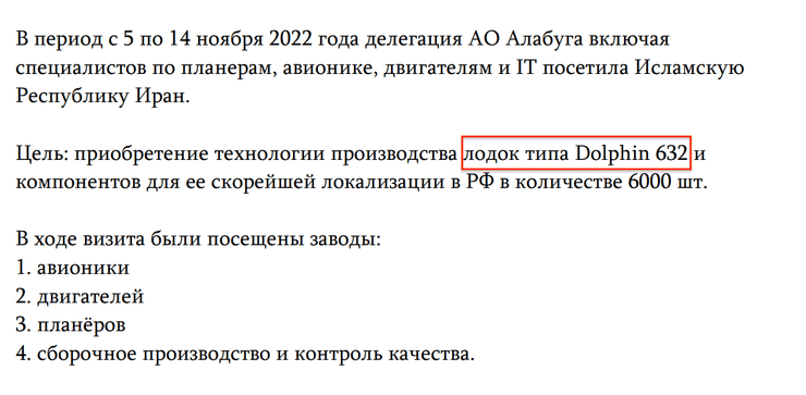 Один з документів з масиву отриманої інформації свідчить про розробку в Єлабузі безпілотників саме за іранським зразком — це лист з вимогою до низки працівників надати звіти про відрядження за 2023 рік. Згідно з документом видно, що кілька працівників літали у відрядження до Тегерану.