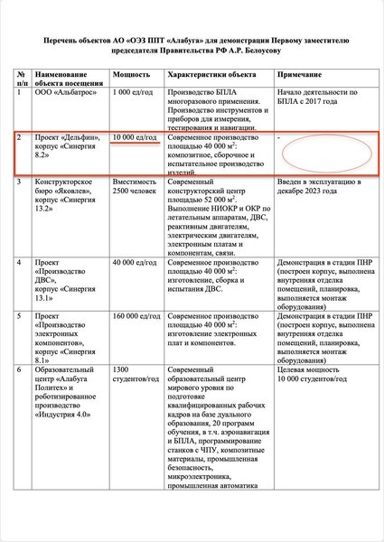 Так, у березні 2024 року до "Алабуги" планувався візит Першого заступника голови уряду РФ Андрія Бєлоусова, який за сумісництвом виконує ще й функції голови Урядової комісії з питань розвитку безпілотних авіаційних систем. В планах його візиту було відвідування "чинних виробництв "Альбатрос" і "Дельфін""