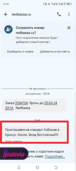 У суботу, 27 квітня, користувачі квиткового сервісу RedKassa почали отримувати на мобільні телефони смс-ки із запрошенням на безкоштовний концерт Кобзона в "Крокус Сіті Холі". Про це повідомив телеграм-канал "Осторожно, новости", який прикріпив до свого посту кілька скріншотів із повідомленнями від RedKassa.