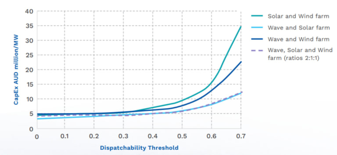 За словами засновника WaveX Саймона Ренвіка, недавній звіт Центру досліджень синьої економіки (CRC) "Енергія хвиль океану в Австралії" показує, що капітальні витрати на сонячну електростанцію можна скоротити на 50%, якщо інтегрувати в неї енергію хвиль. Він зазначив, що з'єднання сонячних і хвильових систем може істотно вплинути на вартість відновлюваної енергії, оскільки хвилі є навіть за відсутності сонячного світла. Те саме стосується вітрової енергії.
