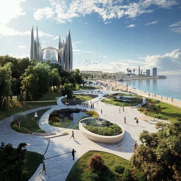 Маріуполь після війни за версією штучного інтелекту виглядатиме як сучасне місто, яке поєднує технології з пам'яттю про минуле. Фото майбутнього Маріуполя опублікував телеграм-канал "Місто Марії", який репостнула Маріупольська міська рада.