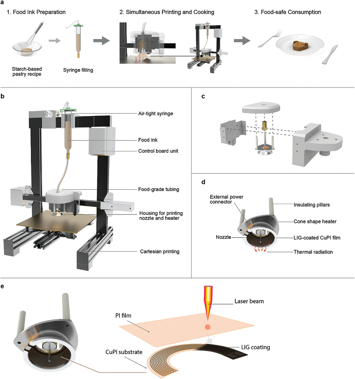 Вчені продемонстрували роботу свого принтера на прикладі тіста для печива. Коли кожен шар тіста виходить із друкувального сопла, інфрачервоний нагрівач негайно готує його, зберігаючи точну надруковану форму і вбиваючи шкідливі бактерії. Це запобігає осіданню і деформації, які зазвичай відбуваються, коли надруковані харчові продукти чекають на випічку.