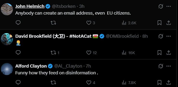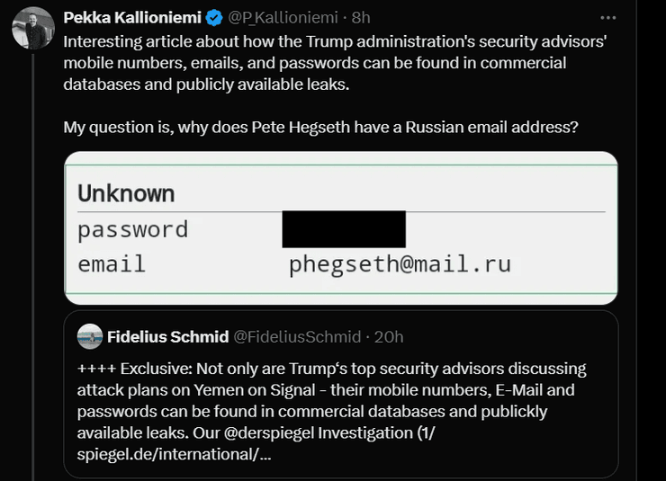 Фінський дослідник дезінформації Пекка Калліоніємі звернув увагу на розслідування і написав у соцмережі Х: "Моє запитання: чому в Піта Гегсета — російська електронна адреса?" Також він надав скріншот з адресою глави Пентагону.